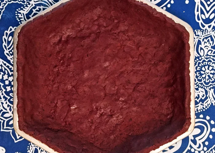 In a medium bowl, whisk together the powdered sugar, flour, cocoa powder, granulated sugar, and salt together until combined. Drizzle with the melted butter and stir until blended. Use your hands to combine the mixture until it forms crumbs and begins to stick together. Press the dough in the bottom and up the sides of a 9-inch pie pan to a thickness of ¼ inch. (You may have some dough left over.)
