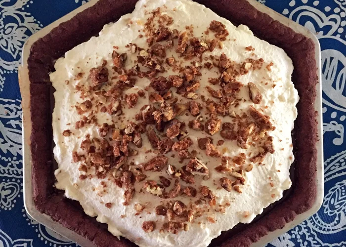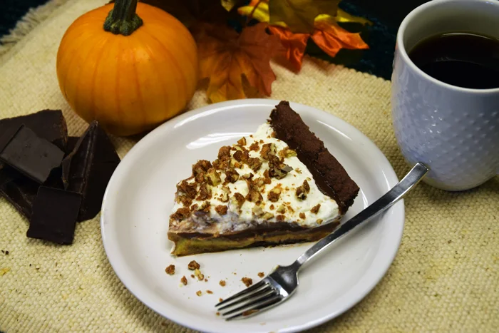 In this elegant layered pie, a chocolate crumb crust is topped with a layer of sweet pumpkin custard, smooth chocolate filling, vanilla whipped cream, and pecan praline crumble.