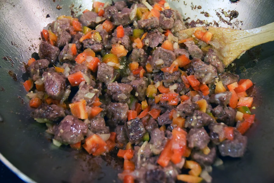 When onion is soft, add red pepper, garlic, beef stock, tabasco and spices: chili powder, cumin, coriander, oregano and cayenne pepper.